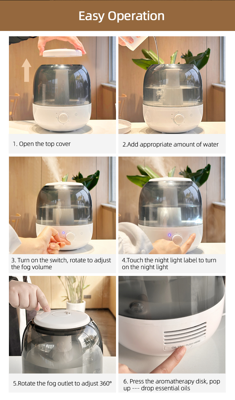 เครื่องเพิ่มความชื้นในอโรมาเธอราพีอัลตราโซนิกใหม่ของเราความจุขนาดใหญ่ 5 ลิตรใช้ไฟฟ้าในบ้านทำให้การใช้งานของคุณปลอดภัยและใกล้ชิดยิ่งขึ้น นุ่มนวลกว่าเครื่องทำความชื้นทั่วไป และไม่รบกวนการเรียน การทำงาน และการพักผ่อนของคุณ เติมน้ำบนถังน้ำ สะดวก รวดเร็ว ถังน้ำใส สามารถมองเห็นระดับน้ำได้ หมอกละเอียดนาโน 300 มล./ชม. หมอกสูงสุดวิ่งได้ 8 ชม. หมอกขั้นต่ำวิ่งได้ 50 ชม. สามารถเพิ่มอโรมาเธอราพีเพื่อบรรเทาอารมณ์ของคุณได้ ตัวเครื่องทำความชื้นมีไฟกลางคืนแบบแยกอิสระ เพื่อให้ค่ำคืนของคุณเต็มไปด้วยความปลอดภัย